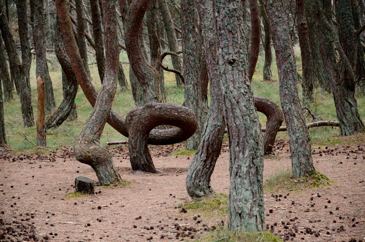 Вы наверняка видели странные коряги или деревья, изогнутые ветром. Но представьте себе целый лес, где стволы сосен не тянутся к солнцу, а закручиваются в кольца, спирали и причудливые петли, будто их в детстве кто-то заплел в косы, а они так и остались. Это не сказка и не фотошоп. Это реальное место в России, в Калининградской области. Его так и называют – Танцующий или Пьяный лес. Зрелище это и правда завораживающее и немного жуткое. Идешь по обычному хвойному лесу, и вдруг… Молодые сосны здесь, вместо того чтобы быть прямыми, как свечки, изгибаются у самого основания, рисуя у земли кольцо или зигзаг, а затем снова пытаются расти вверх. Получаются живые скульптуры, похожие на кренделя, вопросительные знаки или замерших в танце существ. Самое известное дерево – это идеальное кольцо, в которое даже может пролезть человек. Почему же так произошло? На этот счет есть целый букет версий – от научных до самых что ни на есть мистических. Версия первая (научная): виновата гусеница или грибок