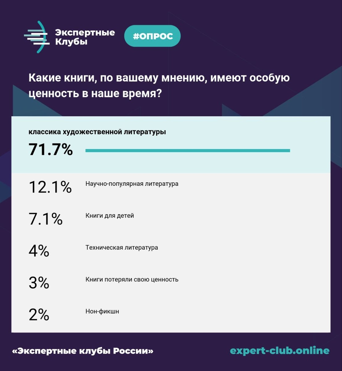 Члены «Экспертного клуба» обсудили ценность современной литературы. Большая часть экспертов (71.7%) считает, что самую большую ценность сегодня имеет классика художественной литературы.
