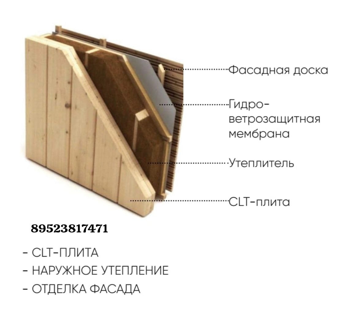 CLT 120 мм + 100 мм утеплитель + планкен - CLT 120 мм — несущая конструкция из многослойной клееной древесины, обеспечивающая высокую прочность и стабильность. - 100 мм утеплитель — эффективный теплоизоляционный слой, снижает теплопотери, улучшает энергоэффективность здания. - Планкен — декоративная и защитная отделка фасада, устойчив к влаге и ультрафиолету, обеспечивает вентиляцию стены. Преимущества системы - Высокая прочность и теплоизоляция в одном комплексе. - Экологичность и долговечность благодаря натуральным материалам. - Современный эстетичный внешний вид с возможностью выбора цвета и фактуры планкена. Применение - Жилые дома, коттеджи, общественные здания с требованиями энергоэффективности и современной отделки. - Быстрый и чистый монтаж #быстровозводимыедома