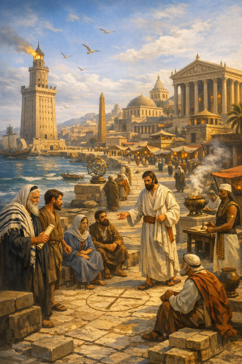 Иудейский Закон и пророчества обрели язык Платона и Аристотеля. В синагогах Александрии, рядом с ортодоксальными иудеями, молились «боящиеся Бога» – язычники, привлечённые стройностью монотеизма и высотой этики, но не готовые к полному обращению. Именно эта среда, уже знакомая с концепциями Единого Бога, греха и искупления через греческую призму, оказалась наиболее восприимчивой. В Александрии писали иудейско-эллинистические философы вроде Филона, пытавшегося совместить Платона с Моисеем.