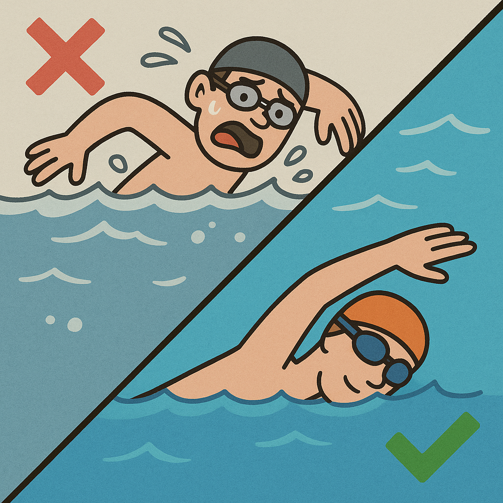 Что делать: замедлить работу ног, сделать ее ритмичной, плавной и спокойной. 4. Частые рваные гребки без скольжения Как выглядит: руки мельтешат, темп высокий, движения короткие.