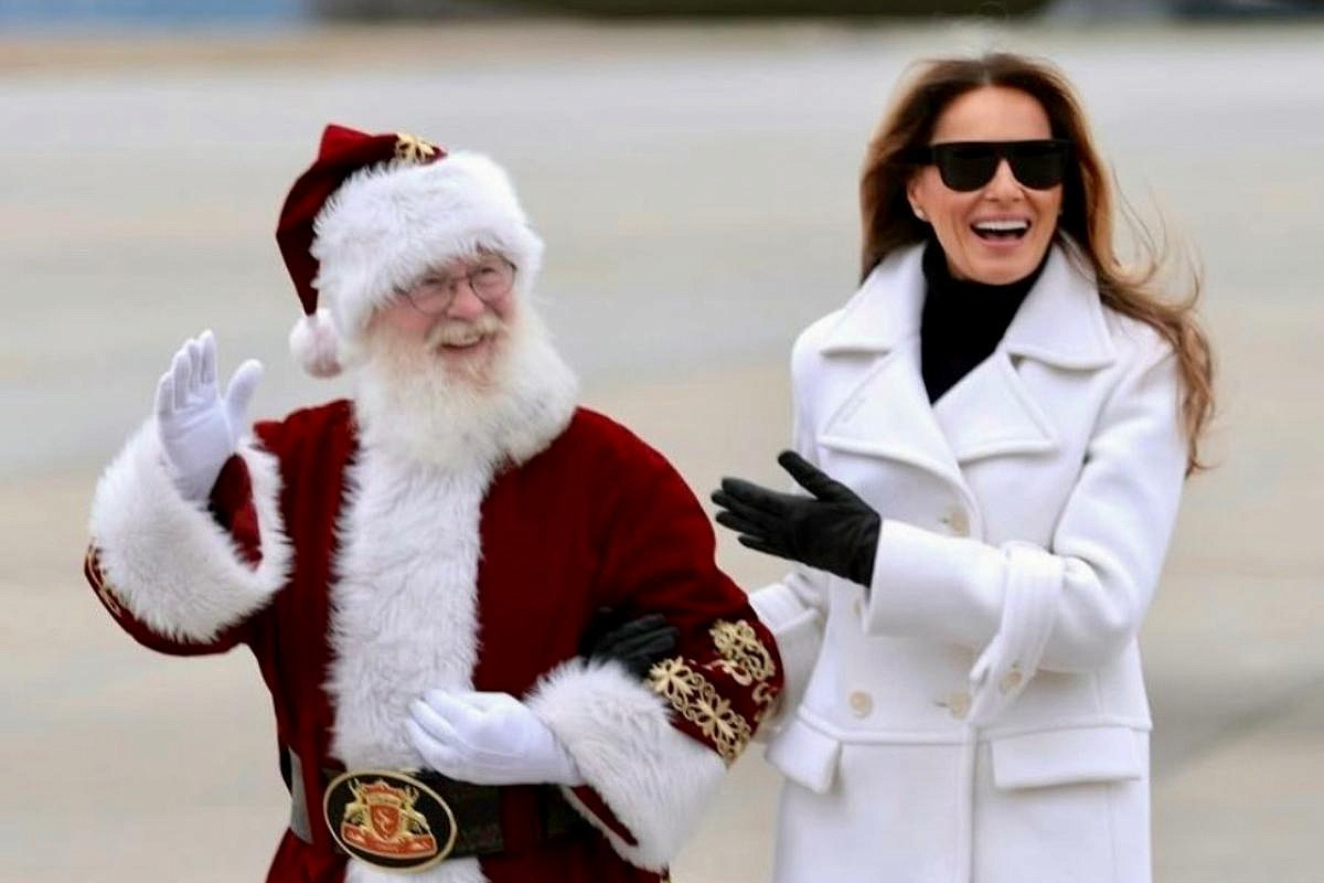 Меланией Трамп формула меняется: чёрный тотал-лук, белое пальто, походка уверенной женщины со сложной судьбой — и Санта рядом как декорация