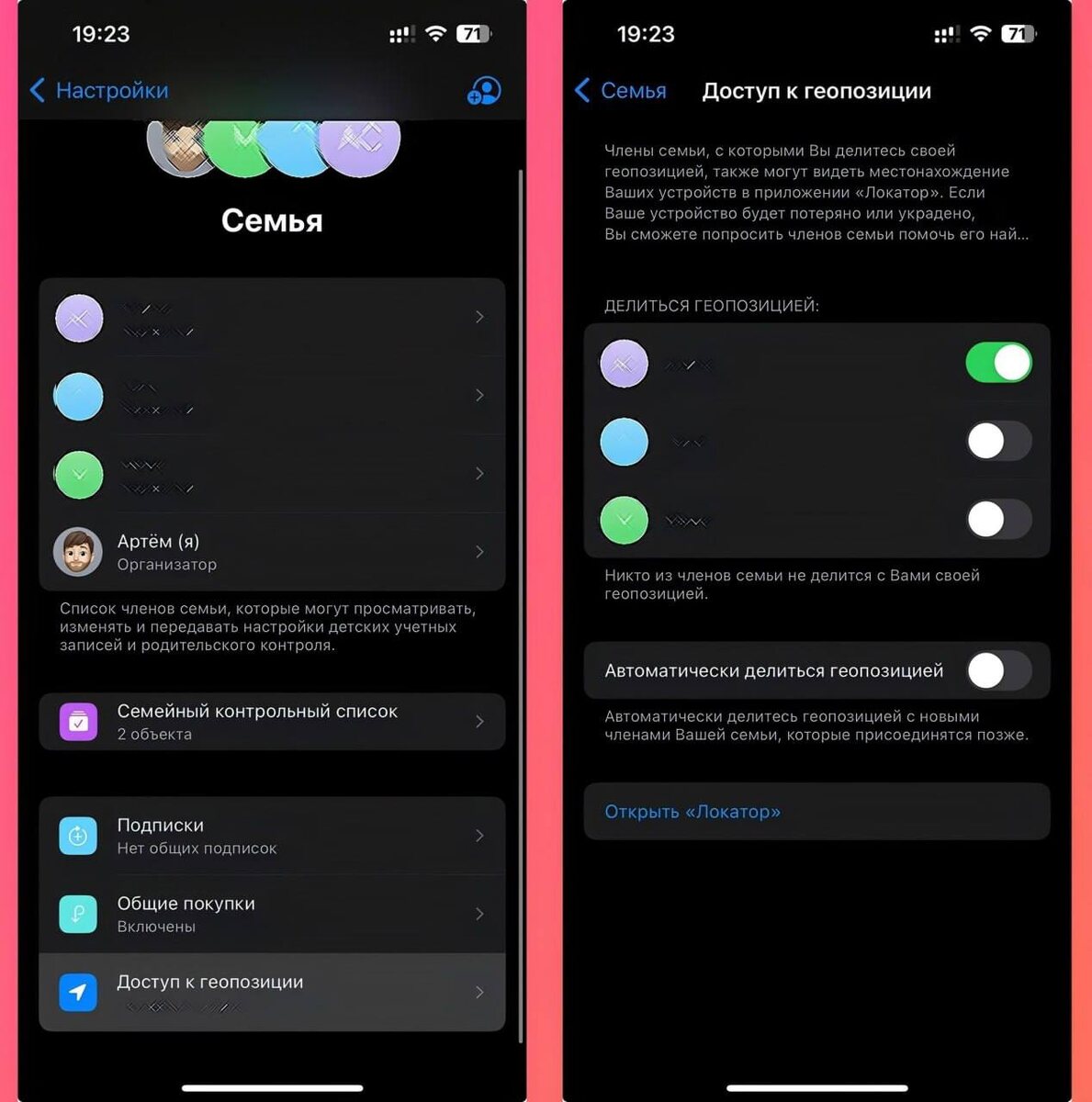 «Два способа поделиться геолокацией на iPhone, о которых знают не все». Если нужно быстро объяснить, где вы находитесь, или хотите, чтобы близкие всегда могли увидеть ваше местоположение, в iPhone есть две максимально простые и надёжные функции. Работают они без лишних настроек и занимают всего минуту. Постоянный доступ через «Локатор» — лучший вариант для семьи Этот способ подходит тем, кто хочет, чтобы родные всегда могли видеть ваше местоположение. Один раз включаете — и всё работает в автоматическом режиме. Откройте «Настройки» → «Семья» → «Доступ к геолокации», выберите нужного человека и включите общий доступ. После этого ваше местоположение будет отображаться в приложении «Локатор» без каких-либо дополнительных действий. Временный доступ через iMessage — если нужно «здесь и сейчас» Идеально для встречи в городе или разовой поездки. Откройте чат с человеком, нажмите на имя в верхней части экрана и выберите «Поделиться геолокацией». Можно указать время — от одного часа до полно