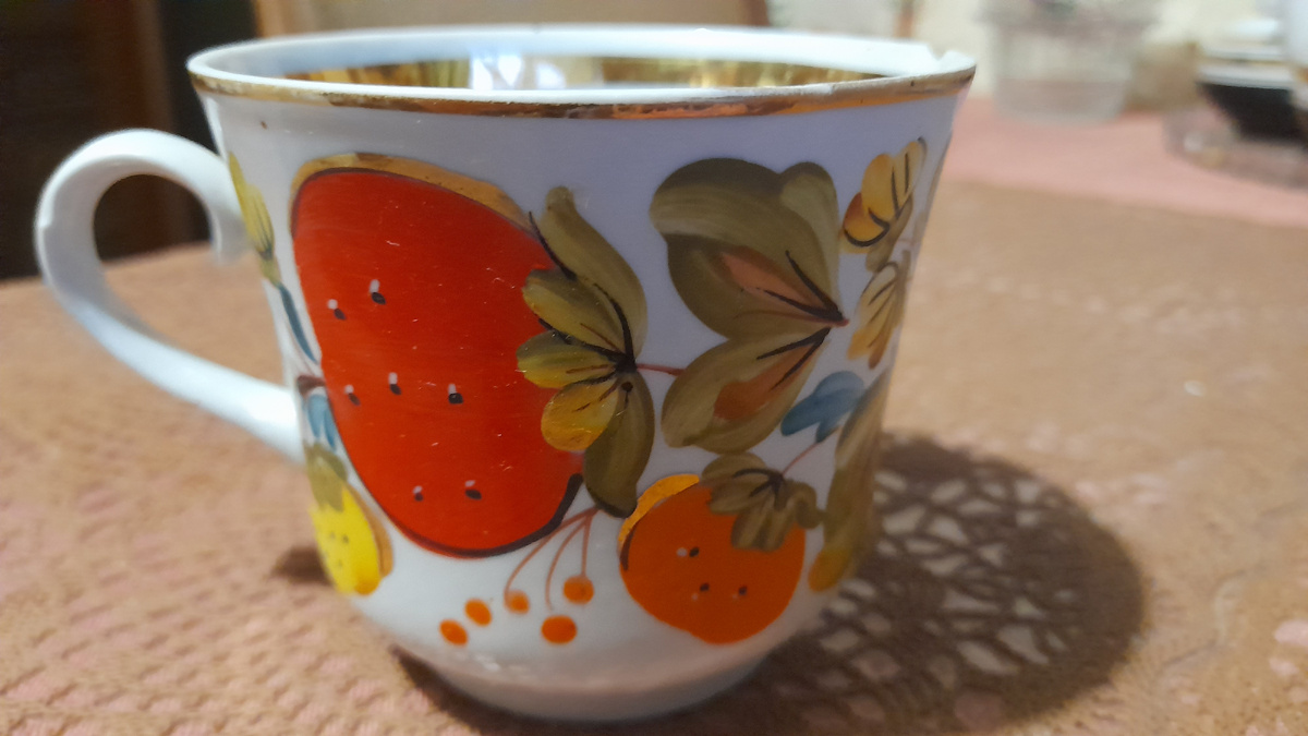 Было это ещё в самом начале моего увлечения винтажным советским фарфором. Присмотрела на Авито несколько, тогда казавшихся мне интересными чайных пар, договорилась с продавцом, и поехала почти под проливным дождём на другой конец нашего далеко немаленького города. Женщина собирала сервизы, у неё было ими заполнено 3 больших шкафа – витрины. Я недорого купила у неё 3 каких-то простецких чайных пары и эту чашку со сколом и трещиной. Уж очень хороша была роспись. Кстати, все те 3 чайных пары от меня уже ушли, а она заняла почётное место на моей «красно-оранжевой» полочке.