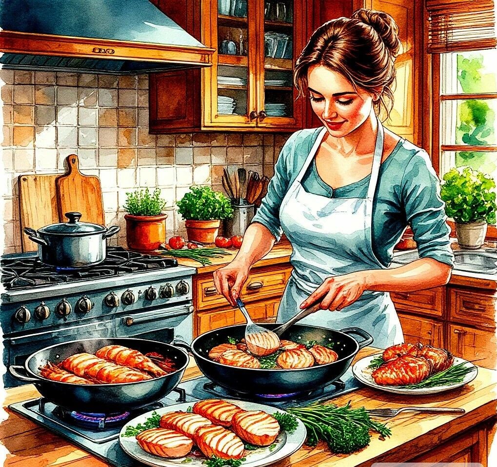 Почему морепродукты так полезны? Морепродукты — это настоящий подарок моря, богатый витаминами, минералами и другими полезными веществами. Они легко усваиваются организмом и при этом обладают множеством полезных свойств. Основные преимущества морепродуктов 🥗 ✅ Белок высокого качества: в 100 граммах морепродуктов содержится около 18–20 граммов белка, который усваивается легче, чем мясной. ✅ Омега-3 кислоты: защищают сердце, улучшают работу мозга и укрепляют иммунитет. ✅ Витамины и минералы: богаты витаминами группы B, A, D, E, йодом, цинком, медью и железом. ✅ Низкая калорийность: всего 90 ккал на 100 грамм продукта. Простые рецепты с морепродуктами Салат с морскими водорослями и авокадо 🥗🥑 Ингредиенты: 100 г сушёных водорослей 1 авокадо 1 огурец 1 болгарский перец Кунжутное масло, соевый соус, лимонный сок Кунжут Приготовление: Замочите водоросли на 10 минут. Нарежьте авокадо, сбрызните лимонным соком. Нарежьте огурец и перец соломкой. Смешайте все ингредиенты, заправь