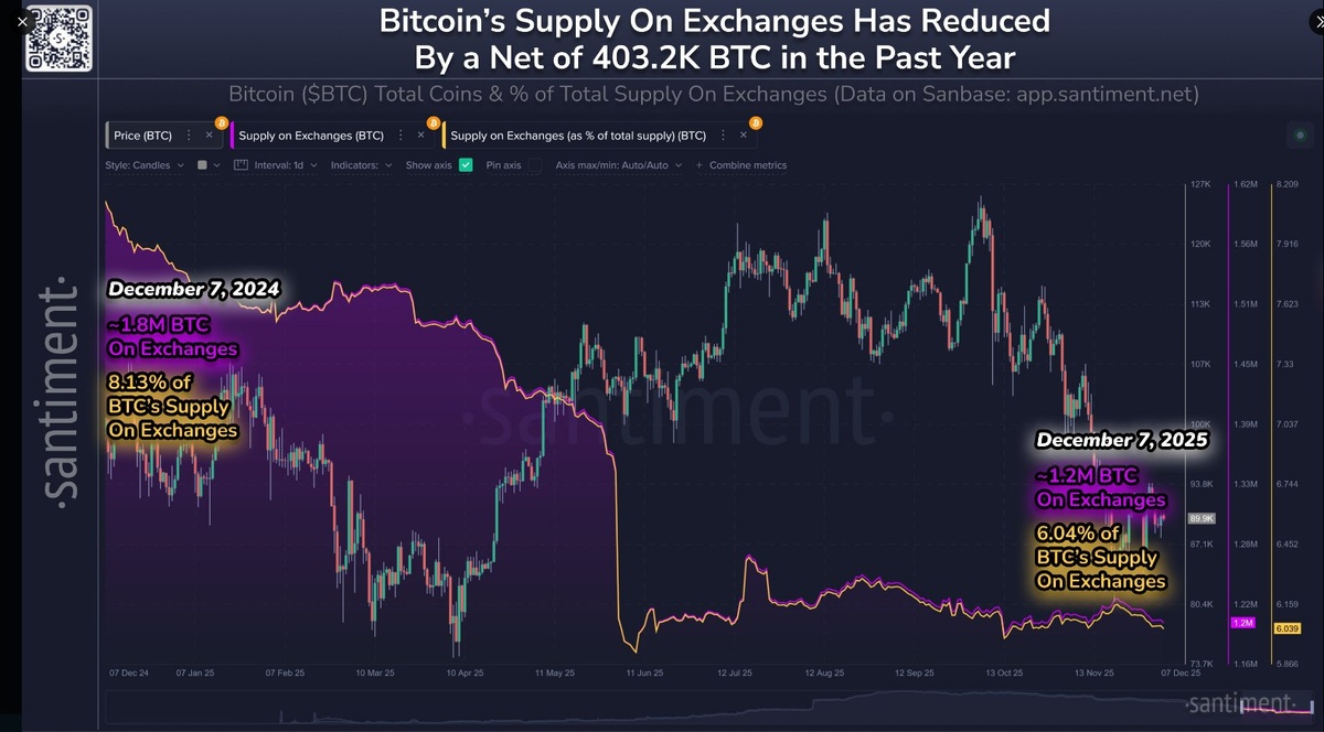 🎯 Крупнейшее годовое сокращение Bitcoin на биржах: Ушло более 400 000 монет Цена: ~$90,650 (+0.28% ↗️) 📰 NEWS: С 7 декабря 2024 года с бирж выведено более 403 000 BTC, что составляет около 2% от общего предложения Bitcoin. Это рассматривается как бычий сигнал, указывающий на сокращение предложения для быстрой продажи и переход монет в долгосрочное хранение и институциональные фонды. 📊 Ключевые моменты: - За последний год с бирж выведено 403,2 тыс. BTC, что привело к снижению общего предложения на биржах на 2,09%. - Институциональные игроки (ETF и публичные компании) активно накапливают Bitcoin, владея уже почти 11% от общего предложения. - Снижение доступного предложения на биржах исторически приводит к уменьшению внезапных распродаж.