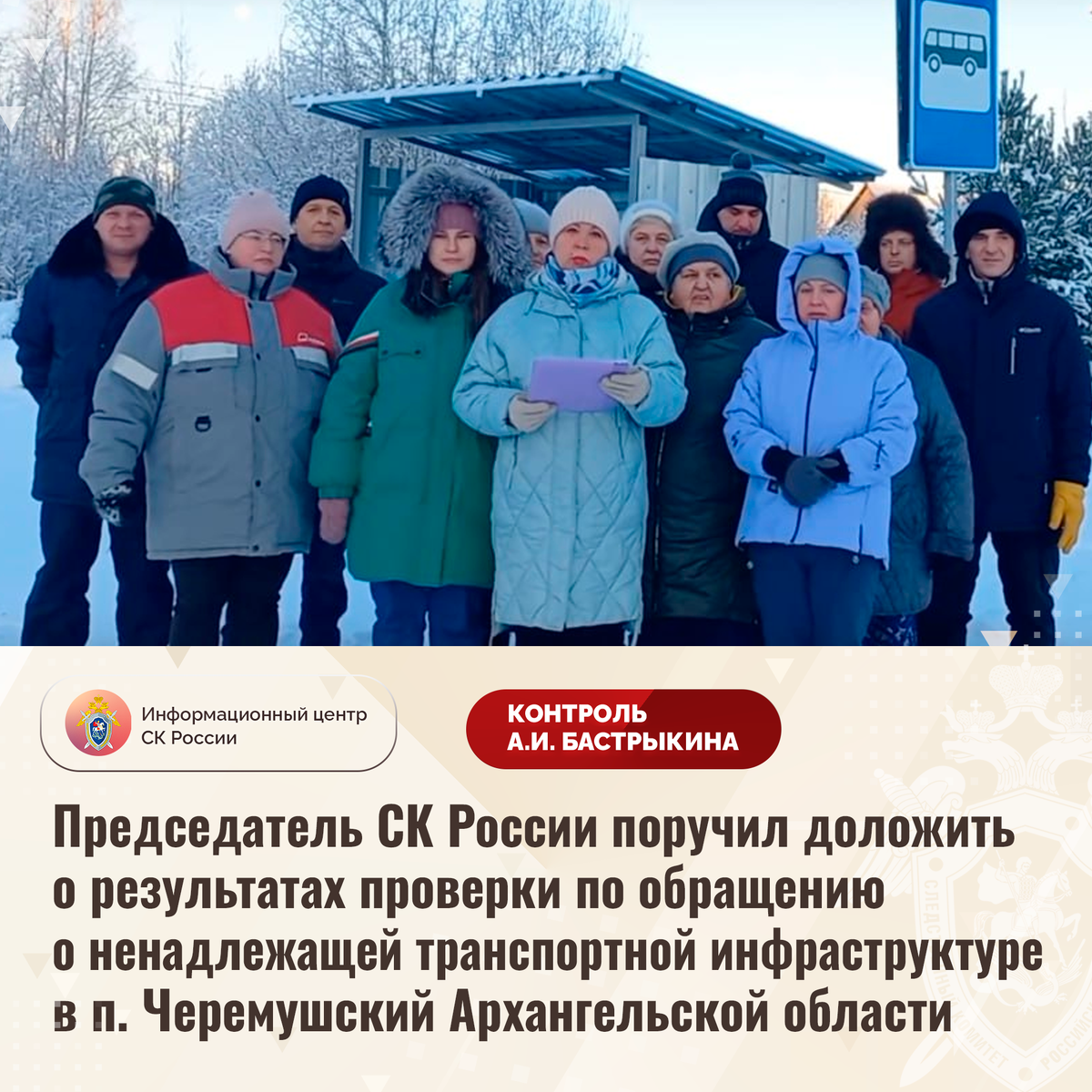 Председатель СК России поручил доложить о результатах проверки по обращению о ненадлежащей транспортной инфраструктуре в п. Черемушский Архангельской области В социальной сети размещено видеообращение жителей поселка Черемушский Архангельской области по вопросу нарушения их прав на качественную транспортную инфраструктуру. Длительное время в поселок не осуществляется следование маршрутного автобуса, в связи с чем граждане вынуждены добираться до ближайшей остановки, расположенной в значительной удаленности от мест их жительства. В прошлом году в населенном пункте построен остановочный павильон, однако маршрут общественного транспорта до настоящего времени не продлен. Многочисленные обращения в различные инстанции результатов не принесли. В СУ СК России по Архангельской области и Ненецкому автономному округу организована процессуальная проверка. Председатель Следственного комитета Российской Федерации Александр Иванович Бастрыкин поручил руководителю СУ СК России по Архангельской обла