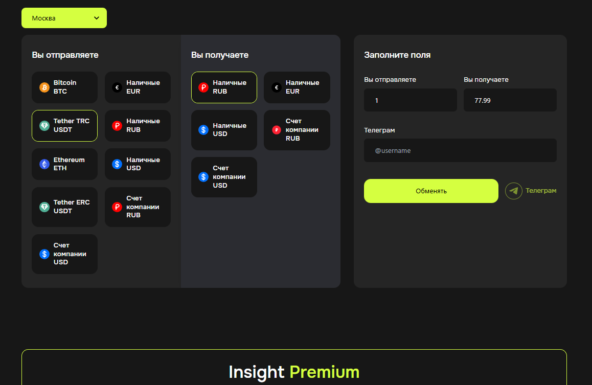 Insight — это ветеран среди обменников криптовалюты в Москве, синоним стабильности и предсказуемости. Его выбирают клиенты, которые ценят неспешную, четкую и отработанную до мелочей процедуру без лишних формальностей. Это надежный вариант для регулярного офлайн обмена криптовалют в Москве.