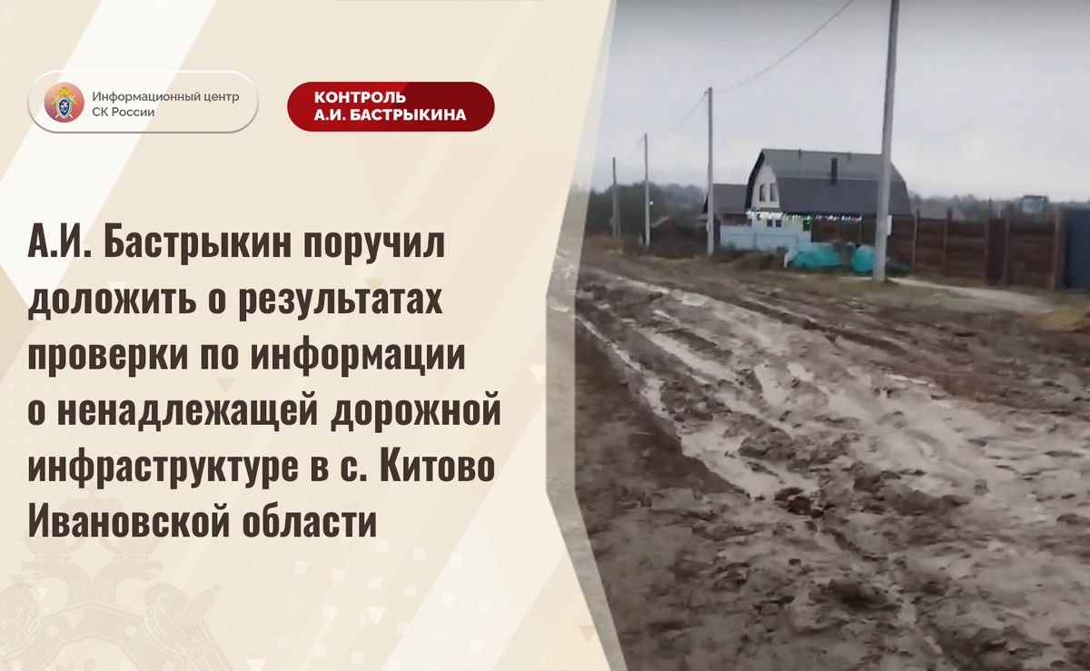А.И. Бастрыкин поручил доложить о результатах проверки по информации о ненадлежащей дорожной инфраструктуре в с. Китово Ивановской области В социальной сети сообщается, что в селе Китово Ивановской области автомобильная дорога на 2-ой улице Мира находится в непригодном состоянии: асфальтовое покрытие отсутствует, грунтовое полотно при выпадении осадков регулярно размывается. В связи с этим проезд транспортных средств и пешее передвижение затруднены, местные жители не могут добраться до социально важных объектов. Несмотря на имеющиеся нарушения, мер к разрешению ситуации не принимается. В СУ СК России по Ивановской области организована процессуальная проверка. Председатель Следственного комитета Российской Федерации Александр Иванович Бастрыкин поручил и.о. руководителя СУ СК России по Ивановской области Эдуарду Михайловичу Шалумову доложить о предварительных и окончательных результатах процессуальной проверки. Исполнение поручения, а также ход процессуальной проверки поставлены на ко