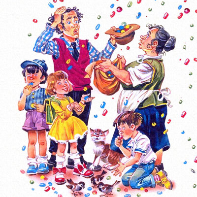 В другой раз генератор «стопиццот» превратил дождь из конфетти в настоящий конфетный дождь, который длился несколько часов и превратил улицы в море сладкого лакомства. Жители Курьеза были в восторге, но городские службы потратили несколько дней на уборку.