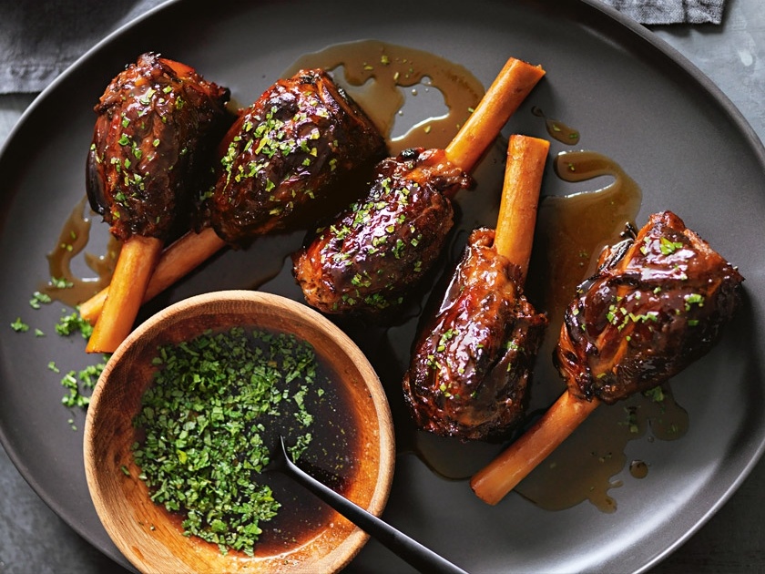 ■ Увеличьте температуру духовки до 220°C. Чеснок мелко порубите, вытрите сковороду и добавьте бульон, чеснок, кленовый сироп, сахар, уксус, апельсиновую цедру, сок и розмарин. Доведите до кипения и залейте бараньи голяшки. Пл