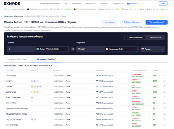 Используйте мониторинг Exnode, чтобы найти криптообменники Перми с адресами, рейтингами и актуальной информацией. Заранее изучите отзывы клиентов об обменниках в Перми, чтобы оценить качество сервиса. Свяжитесь по телефону с выбранной точкой и уточните режим работы, доступные направления и возможность обмена USDT в Перми.