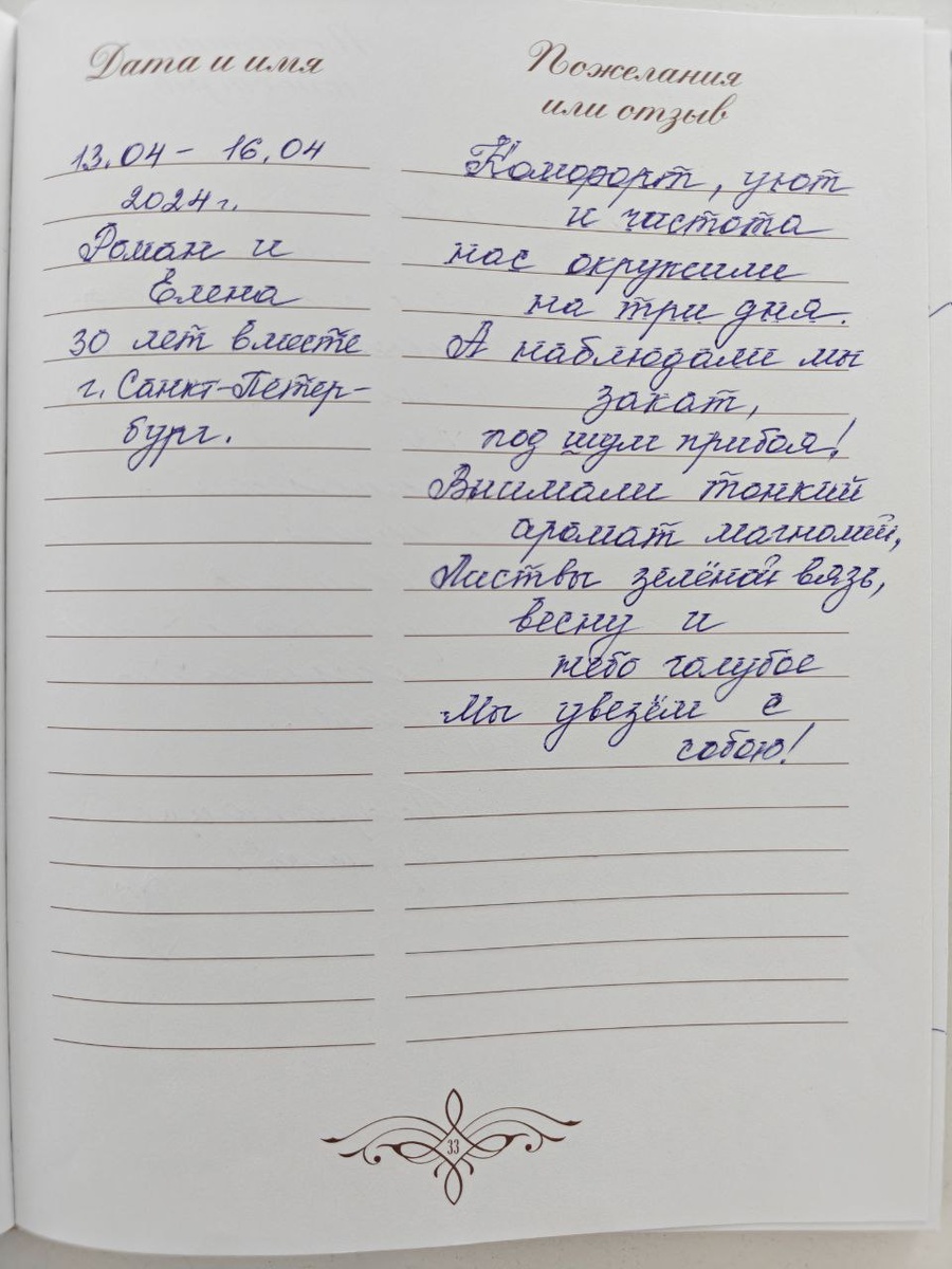 Тот самый, который мы до сих пор бережём: «Комфорт, уют и чистота нас окружили на три дня.