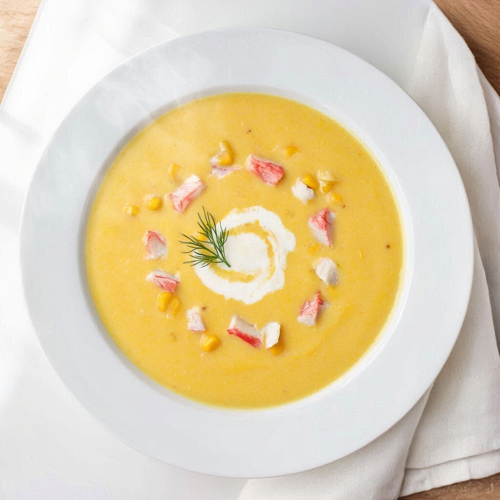 1. 🥣Сливочный суп-пюре из кукурузы с крабовыми палочками
