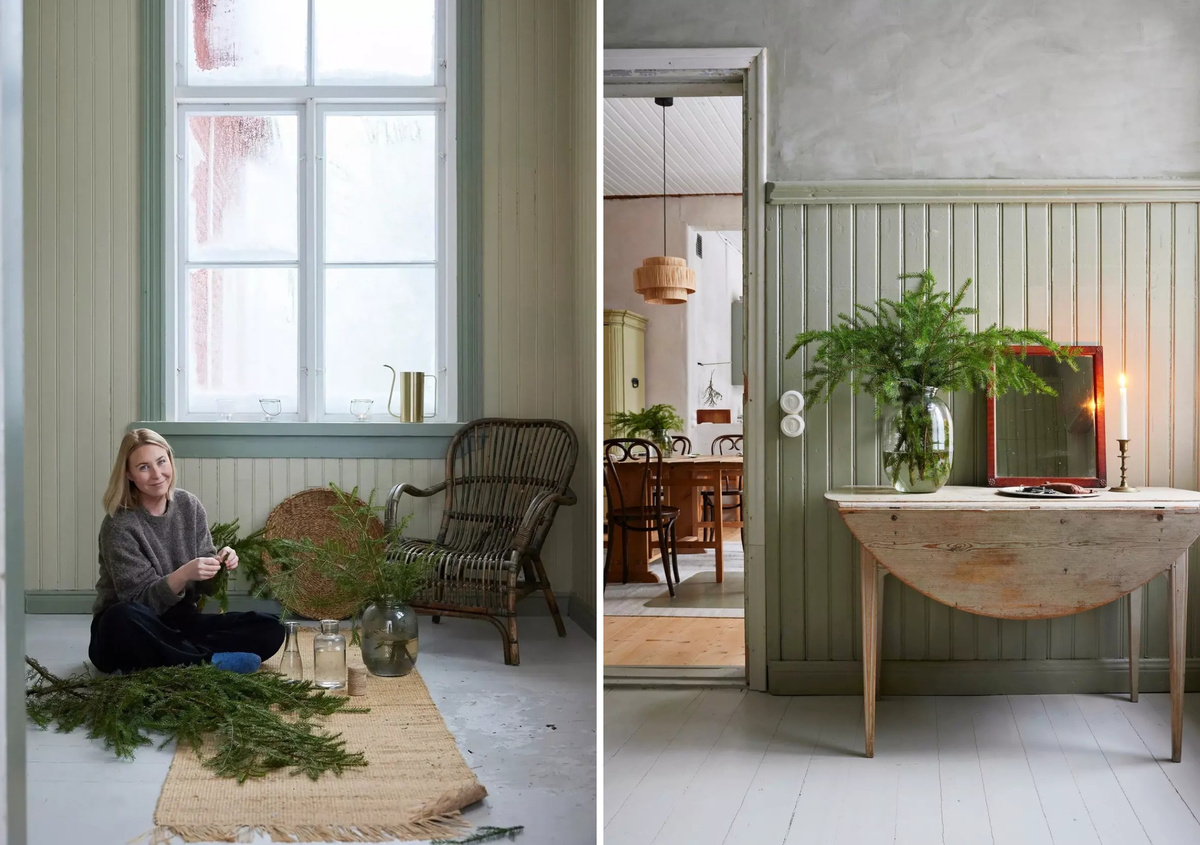 Каждый декабрь Нинни украшает свой удивительный дом к Рождеству и Новому году. Она любит минимализм и природные материалы. Ее любимый способ создать праздничное настроение дома: повсюду расставить в вазах или обычных стеклянных банках свежие еловые ветки.
