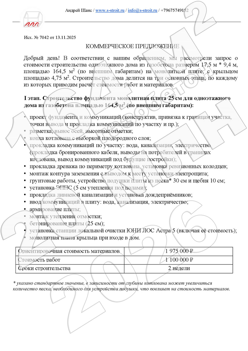 Вчера было КП на каркасник с лофтом, а сегодня актуальный расчёт по газобетону – одноэтажный дом на монолитной плите площадью 164,5 м2.