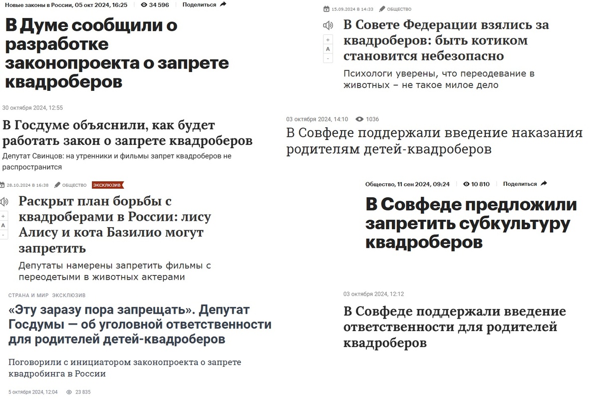Наверное, большинство помнит, как всего год назад в топе новостей были так называемые "квадроберы". Проблема была настолько серьезной, что и Дума и Совет Федерации, отложив все свои важнейшие дела занялись защитой граждан от этой заразы. Всерьез обсуждали не только административную, но даже уголовную ответственность! Некоторые несознательные граждане, видимо не понимавшие всю серьезность этой проблемы, легкомысленно рисовали разнообразные демотиваторы. Но, прошел год и тема про квадроберов куда-то исчезла! Что же случилось? Квадроберы "самоликвидировались"? Убежали в леса? Почему же тогда РПЦ продолжает заниматься этим вопросом? Госдума и СовФед не справились, и вся надежда только на РПЦ? Граждане, просьба разъяснить!