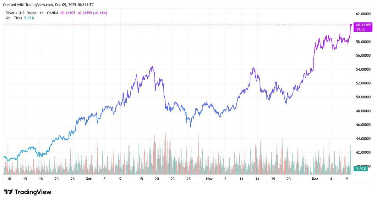 Дамы и Господа, стоимость серебра на международной бирже сегодня поставила очередной рекорд, 60.5$ за троицкую унцию (31.1 грамм), то есть