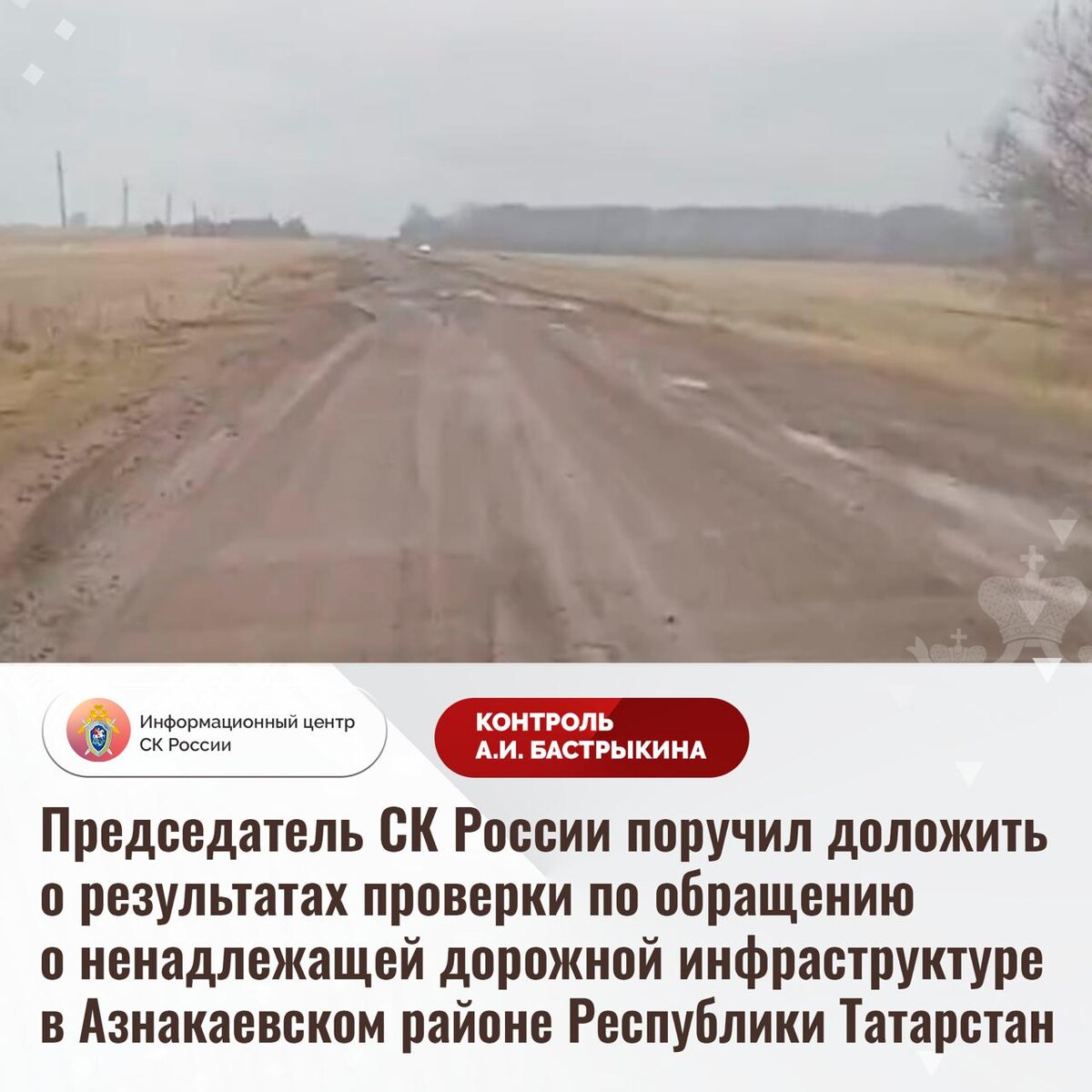 Председатель СК России поручил доложить о результатах проверки по обращению о ненадлежащей дорожной инфраструктуре в Азнакаевском районе