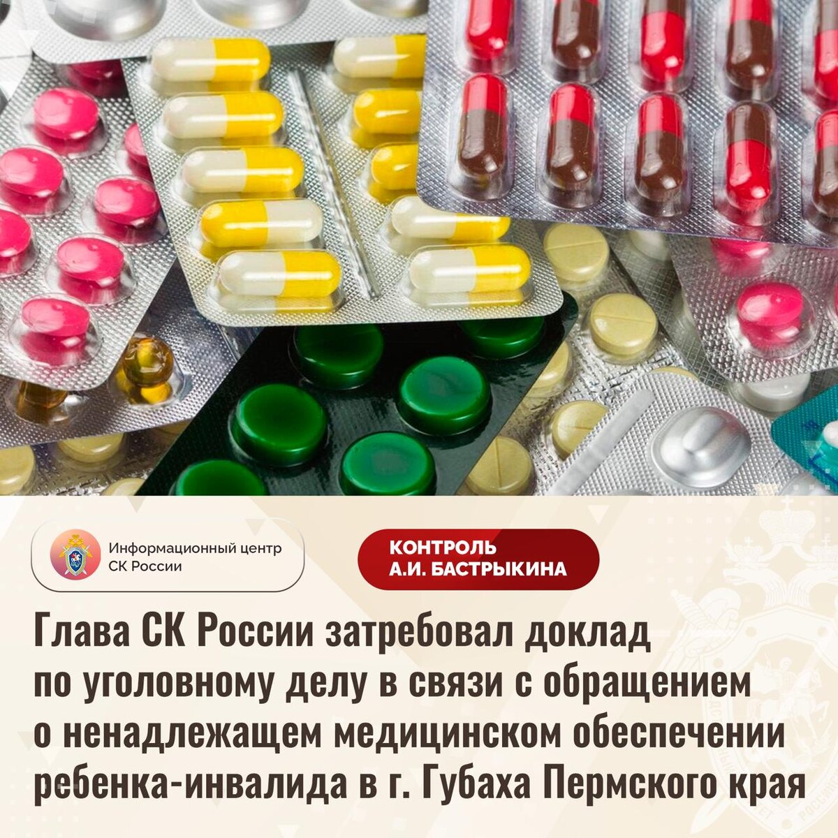 Глава СК России затребовал доклад по уголовному делу в связи с обращением о ненадлежащем медицинском обеспечении ребенка-инвалида в г. Губаха Пермского края В приёмную Председателя СК России А.И. Бастрыкина в социальной сети «ВКонтакте» обратилась жительница города Губаха Пермского края по вопросу нарушения прав ее 16-летней дочери, являющейся инвалидом, на качественное медицинское обеспечение. В октябре текущего года девушке назначен регулярный прием лекарственных препаратов. Однако до настоящего времени необходимые медикаменты несовершеннолетней не выданы, в проведении необходимых исследований отказано. В связи с этим часть лекарств мать вынуждена приобретать за свой счет. Обращения женщины в различные инстанции результатов не принесли. В СУ СК России по Пермскому краю возбуждено уголовное дело. Председатель Следственного комитета Российской Федерации Александр Иванович Бастрыкин затребовал у руководителя СУ СК России по Пермскому краю Дениса Валерьевича Головкина доклад о предвари