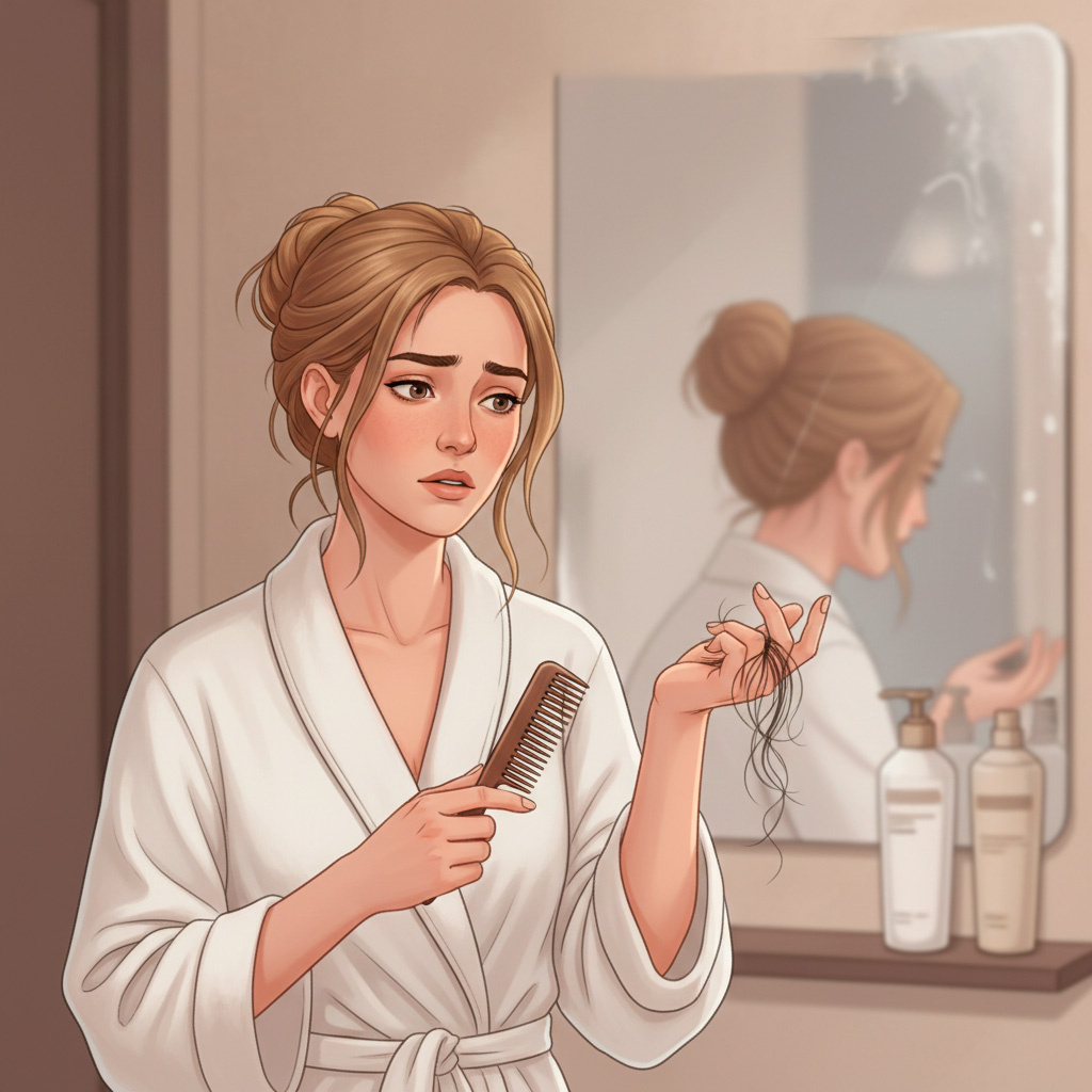 Исследования показывают, что при сильном стрессе большое количество волос может резко перейти из фазы активного роста в фазу покоя. Это не происходит за один день, поэтому есть коварная задержка. Человек переживает тяжёлый период — развод, утрату, серьёзную болезнь, внезапное увольнение — а заметное выпадение начинается только через полтора–три месяца. Из‑за этого связь «событие — волосы» часто даже не отслеживается.