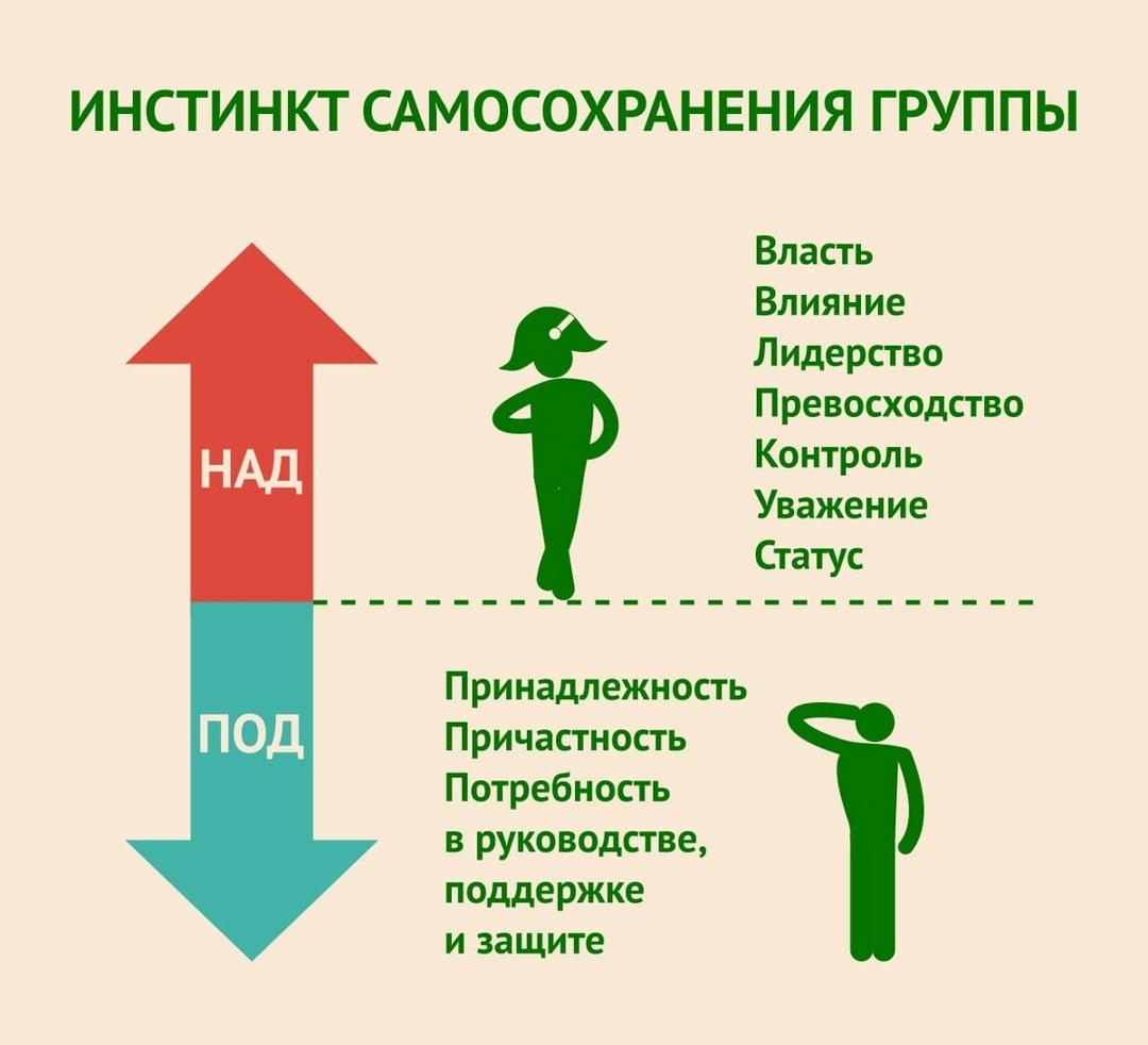 Всё это вполне понятно с точки зрения нашего инстинкта самосохранения группы, или социальной (иерархической) потребности. Эта биологическая «программа», которая отвечает за наше выживание как социальных существ. И хотя мы больше не живём племенами в саванне, потребность быть частью группы и занимать в ней определённое место — всегда с нами.