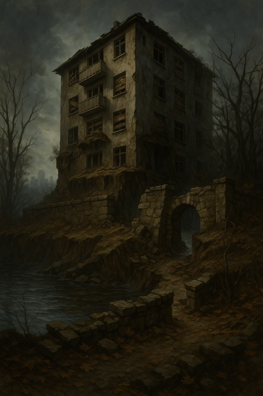 Старая разрушающаяся пятиэтажка располагалась почти в самом центре города. Здание стояло на берегу, и лишь какое-то чудо удерживало его от падения, что нельзя было сказать о каменной ограде: несколько секций уже упали в воду и образовали проход. Стоило мне пересечь границу забора, как городские звуки стали приглушёнными и далёкими. Им на смену пришла настороженная тишина. Слой опавшей листвы пружинил под ногами, пока я обходил вокруг здания, ища проход внутрь. Окна нижних этажей были заколочены фанерой и досками; верхние сверкали остатками стёкол. Подъездные двери были заварены металлическими пластинами настолько надежно, что невольно возникал вопрос: чтобы не впускать или чтобы не выпускать. Почти обойдя дом по периметру, я добрался до пролома в стене.