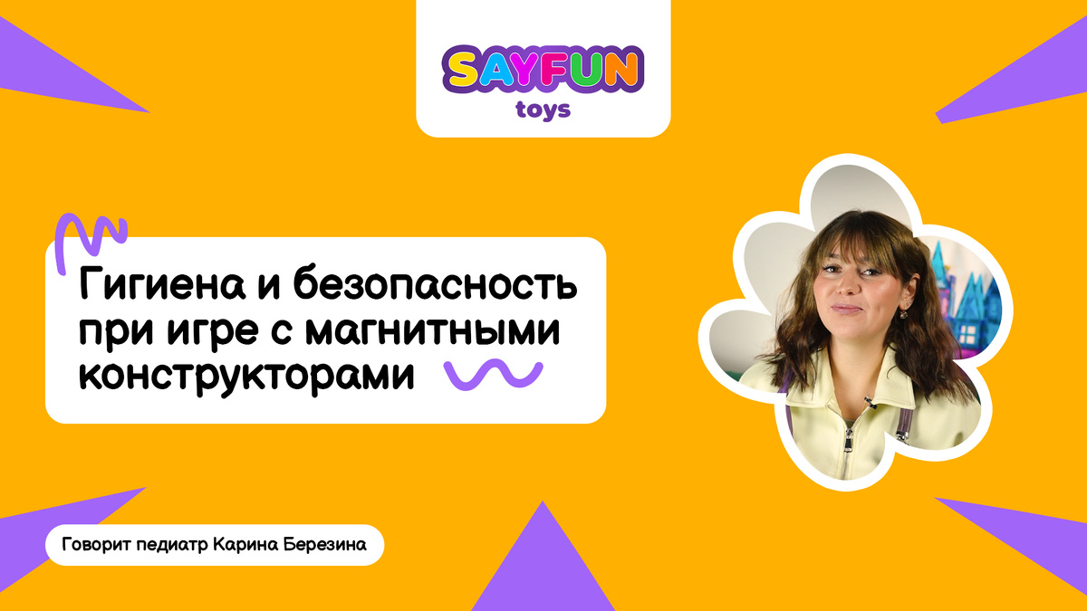 Меня зовут Карина Березина, я педиатр и мама. На нашем канале SAYFUN toys мы не просто показываем игрушки, а говорим о самом важном - как играть с пользой и в безопасности. Сегодня разберём конструкторы. Они крутые, развивающие, но есть два ключевых момента: чистота и безопасность. Давайте по пунктам, без лишней сложности. 🧼 Чистота: 3 простых правила Гигиена — это не страшно, это быстро. Руки перед игрой. Самое простое и важное правило. Чистые руки - меньше грязи на деталях. Как чистить сами магниты? Влажной салфеткой или мягкой тканью. Никакой агрессивной химии! Где хранить? В сухом месте, в коробке или контейнере. Так на конструкторе не будет скапливаться пыль. Соблюдаем этот минимум - и с гигиеной полный порядок! ⚠️ Безопасность: на что смотреть в первую очередь А вот здесь внимание должно быть максимум. Конструкторы - это не просто детальки. Главное правило: конструктор - не для рта! Объясните это ребёнку перед игрой. Это тренажёр для фантазии, а не для проглатывания. Что прове
