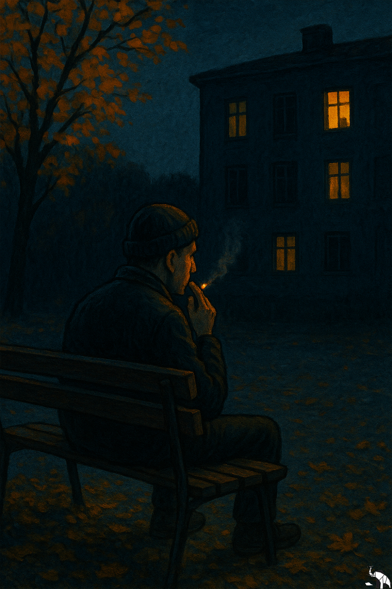 Оглядывается на окна своей квартиры. Улыбается, легонько пинает стоящее на земле мусорное ведро и идёт к детской площадке на лавочку. Через минуту в аромат листвы и влажной земли, смешанный с дымом погасших костров, вмешивается плотный дым папиросы.