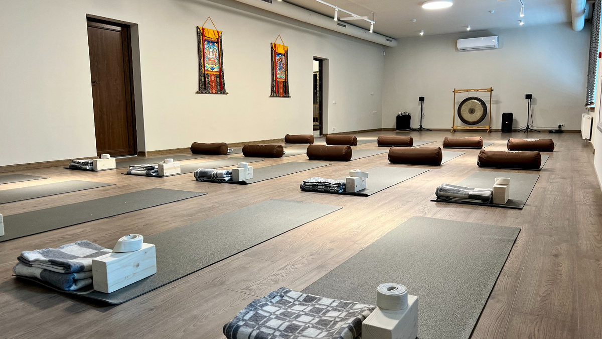 Инструктор помогает мягко войти в практику, выравнивая дыхание и внимание.