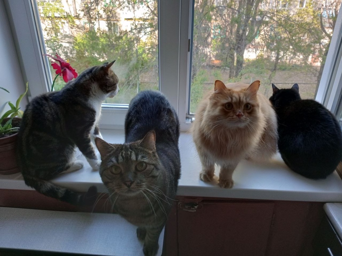 😺 После прохладных ночей утреннее солнце радует, а дневное ещё и согревает. Коты уже не прячутся от него, а занимают места на подоконниках и на балконе - и загорают до 15 часов, когда оно скрывается за всё ещё зелёными кронами деревьев - вязов, тополей и берёз. Лето уходит от нас понемногу...