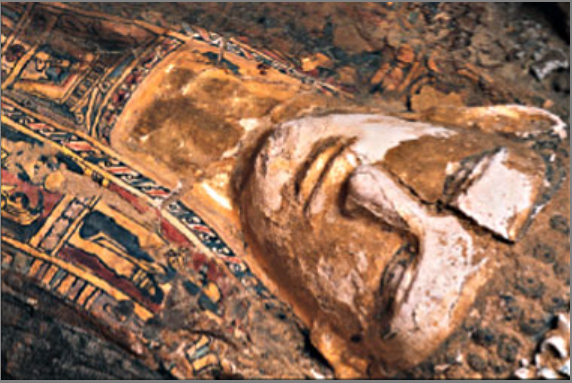 В первой гробнице археологи обнаружили мумии мужчин, женщин и детей. Воздух до сих пор хранит аромат смол, использованных при бальзамировании тысячелетия назад. Картина, представшая перед исследователями, была впечатляющей. В одном из углов находились две мумии — мужская и женская, уложенные лицом друг к другу, что создавало иллюзию их взаимного взгляда. Рядом с ними лежала мумия другой женщины, украшенная золотой маской, гипсовой короной и четырьмя рядами декоративных красных завитков, начинающихся ото лба и заплетённых за уши.