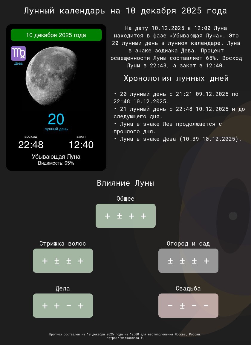 Лунные календари на 10 декабря 2025 года: Подготовьтесь к этому дню с учетом влияния Луны! 🔹🌗 Лунный календарь на 10 декабря 2025 года — Что приготовила Луна? Подробнее 🔹✂️ Лунный календарь стрижек на 10 декабря 2025 года — Подходящий ли день для обновления прически? Подробнее 🔹🌱 Лунный календарь огородника и садовода на 10 декабря 2025 года — Лучшее время для ухода за растениями. Подробнее 🔹📅 Лунный календарь дел на 10 декабря 2025 года — Удачные моменты для важных задач. Подробнее 🔹💍 Лунный календарь свадеб на 10 декабря 2025 года — Подходит ли этот день для вашего торжества? Подробнее