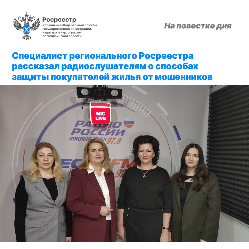 9 декабря 2025 года начальник отдела государственной регистрации недвижимости жилого назначения Управления Росреестра по Челябинской области Ольга Фадеева приняла участие в записи программы на «Радио России – Южный Урал». В последнее время в информационном поле активно обсуждается тема мошенничества на рынке вторичной недвижимости, в том числе схем, в которых после совершения сделки продавец заявляет о нахождении под влиянием (давлением). мошенников. В связи с этим Росреестр выступил с инициативной и представил в Госдуме предложения по защите покупателей жилья. Сегодня в студии радиостанции «Радио России - Южный Урал» Ольга Фадеева совместно с представителями профессионального риелторского сообщества и нотариата рассказала в эфире о предлагаемых Росреестром мерах по защите сделок с жильем. К примеру, были озвучены предложения по созданию особого страхового механизма, усилению ответственности риелторов, а также осуществление сделки через банк с «заморозкой» денег на безопасном счете,