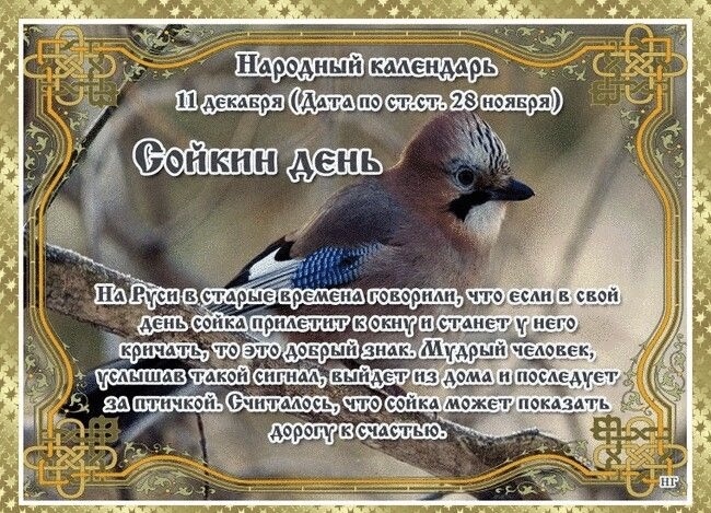 В четверг 11 декабря 2025 года чтят память епископа Русской церкви Феодора Симоновского. Родился он в Москве, точная дата рождения неизвестна. Появился на свет примерно в 1339-1340 гг. В народе 11 декабря называют Сойкин день. Название этого дня посвящено яркой и небольшой по размеру птичке с длинным хвостом, на голове которой красуется хохолок. Птичка отлично имитирует различные звуки, за что её прозвали сойкой-пересмешницей. ❇️ПРИМЕТЫ ✔️Если резко потеплело, то скоро сильно и надолго похолодает. ✔️Гуси крыльями часто хлопают – к оттепели. ✔️Погода холодная и сухая сулит засушливое и жаркое лето. ✔️Зола в печи быстро гаснет – к потеплению. ✔️Вороны в небе хоровод устроили – к снегопаду, сидят на нижних ветках деревьев – к ветру, по земле ходят – к оттепели. ❌ЧТО НЕЛЬЗЯ ДЕЛАТЬ ✔️Ни в коем случае нельзя ругаться и ссориться. Причем не стоит как начинать споры, так и поддерживать их. Считалось, что злость и громкие крики спугнут соек — и удачу вместе с ними. ✔️Существует поверье