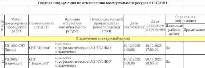 Информация по плановым отключениям в СНТ/ДНТ на 10.12.2025 от ЕДДС города Тюмени