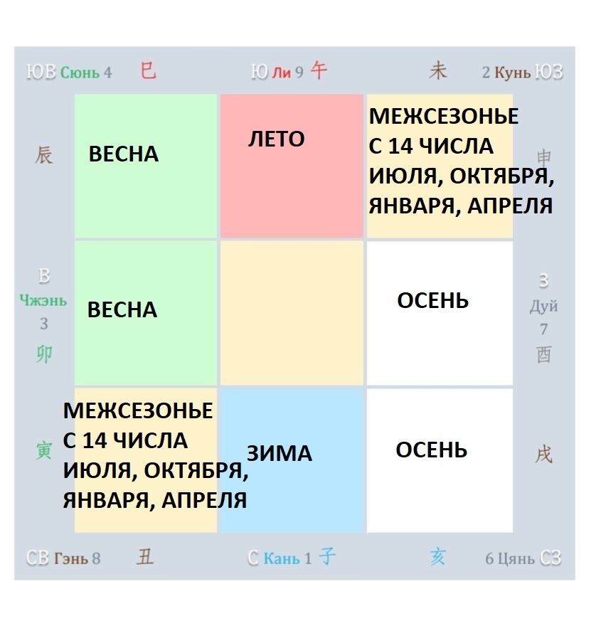 - Январь, апрель, июль, октябрь - ориентировочно с 14 числа- межсезонье - это время Земли. Значит сильны дворцы Гэнь, Кунь, а также металлические- Дуй и Цянь.