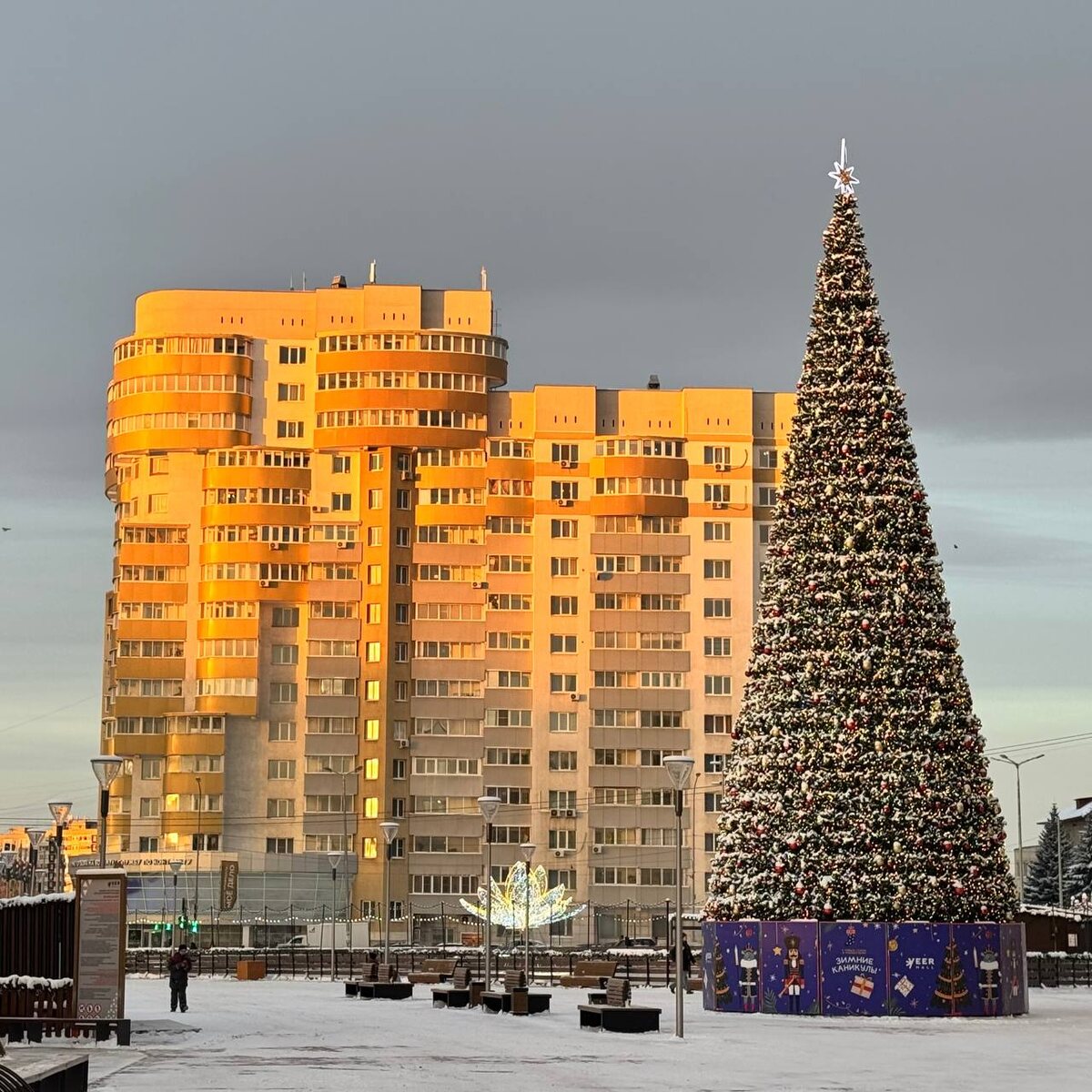А вот такая припорошенная снегом елка на рассвете у Веер Молла. Мы в Мах