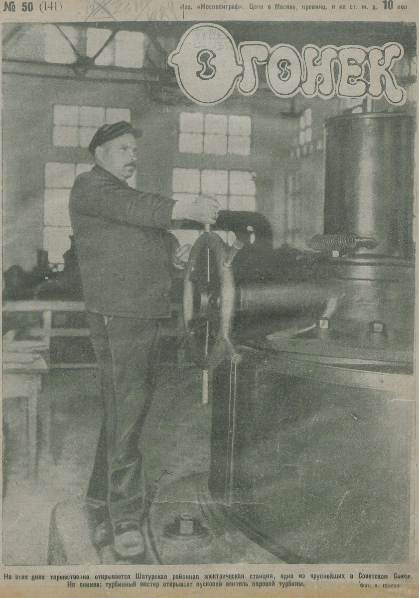 1. В стране полным ходом шла электрификация. О чем сообщается прямо на обложке журнала. Радостное и важное событие - открытие Шатурской районной электростанции.