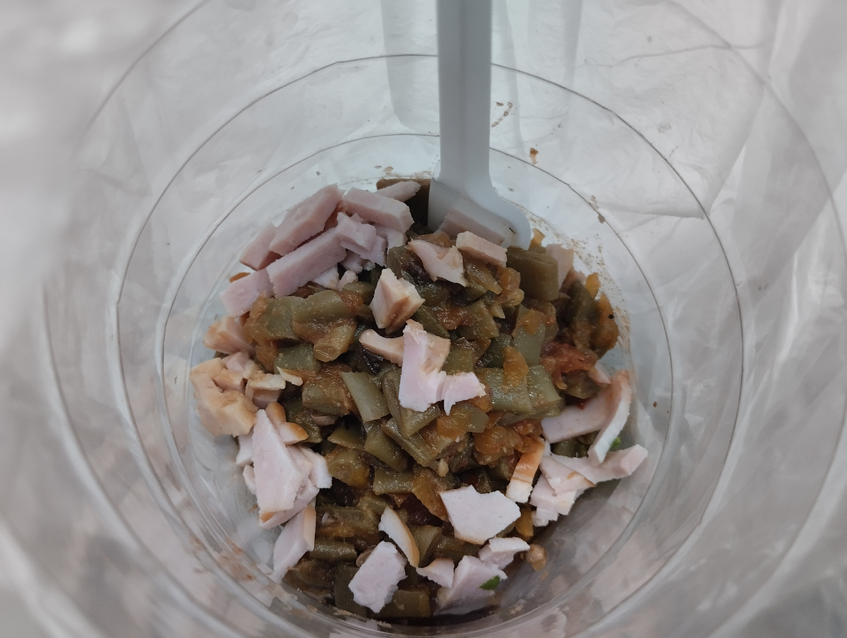 Привет, друзья! Я вчера побила свой собственный рекорд переработок, пришла на работу к 8ми, в ушла в 20 часов и это при том, что прием был до 12ти. Вот это я дала жару😁 зато часть бумажных завалов разгребла.. На работу я беру с собой несколько перекусов, основу для которых заблаговременно готовит для меня ДМ. Иногда я укладываю рабочую еду не в контейнер , который потом надо мыть, а мне лень бывает, а в бутылку от минеральной воды, которую я предварительно обстригла. Удобно- поел одноразовой вилкой и выкинул всю конструкцию. Тут , по моей просьбе, ДМ потушил фасоль, которую я вырастила на своем смешном огороде со сливочным маслом, тыквой перетертыми помидорами, и специями из Абхазии. Потом я в этот салат немного сверху ветчины покрошила. Мне понравился такой вариант, раз или два в неделю вполне можно брать на работу перекусить для разнообразия. И вкусно и полезно и в морозилке место освобождается. Готовит такую фасоль ДМ с вечера-:просто томит на печке ,а утром я гото