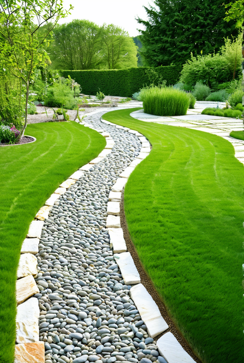 Это сочетание разных материалов‚ например‚ пошаговая дорожка из плитняка в отсыпке из гальки‚ или террасная доска (декинг) рядом с газоном‚ укрепленным через газонную решетку. Это позволяет эффективно зонировать пространство.