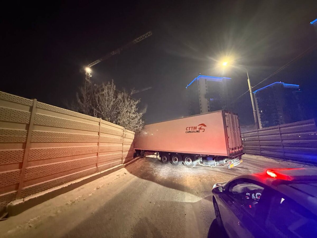 Грузовик перекрыл дорогу на Авиаторов в районе ТЦ «Авиатор
