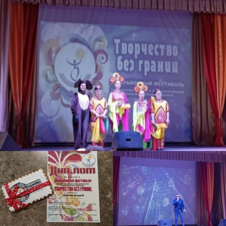 Самодеятельный артист Советского района стал участником фестиваля «Творчество без границ!» Для творчества нет границ! Для творчества нет преград! В районном селе Троицкого района состоялся Межрайонный фестиваль творчества людей с ограниченными возможностями здоровья «Творчество без границ!». От Советского района на фестивале выступил Андрей Майник (руководитель Юрий Яркин). Этот традиционный фестиваль — своего рода гимн людям которые своей силой духа, своей активностью, своим талантом, творчеством являются образцом для подражания для окружающих.