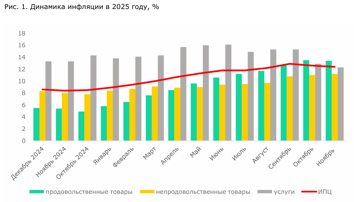 В ноябре годовая инфляция в Казахстане составила 12,4%. Это на 0,2% ниже, чем в октябре. В месячном же выражении рост цен ускорился до 0,8% (против 0,5% в октябре). Продовольственные продукты в прошлом месяце подорожали на 1%.