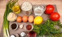 4. В миске аккуратно, но тщательно смешайте все ингредиенты для салата: помидоры, яйца, зелень, оливковое масло, перец Алеппо, острый перец, соль и черный перец.