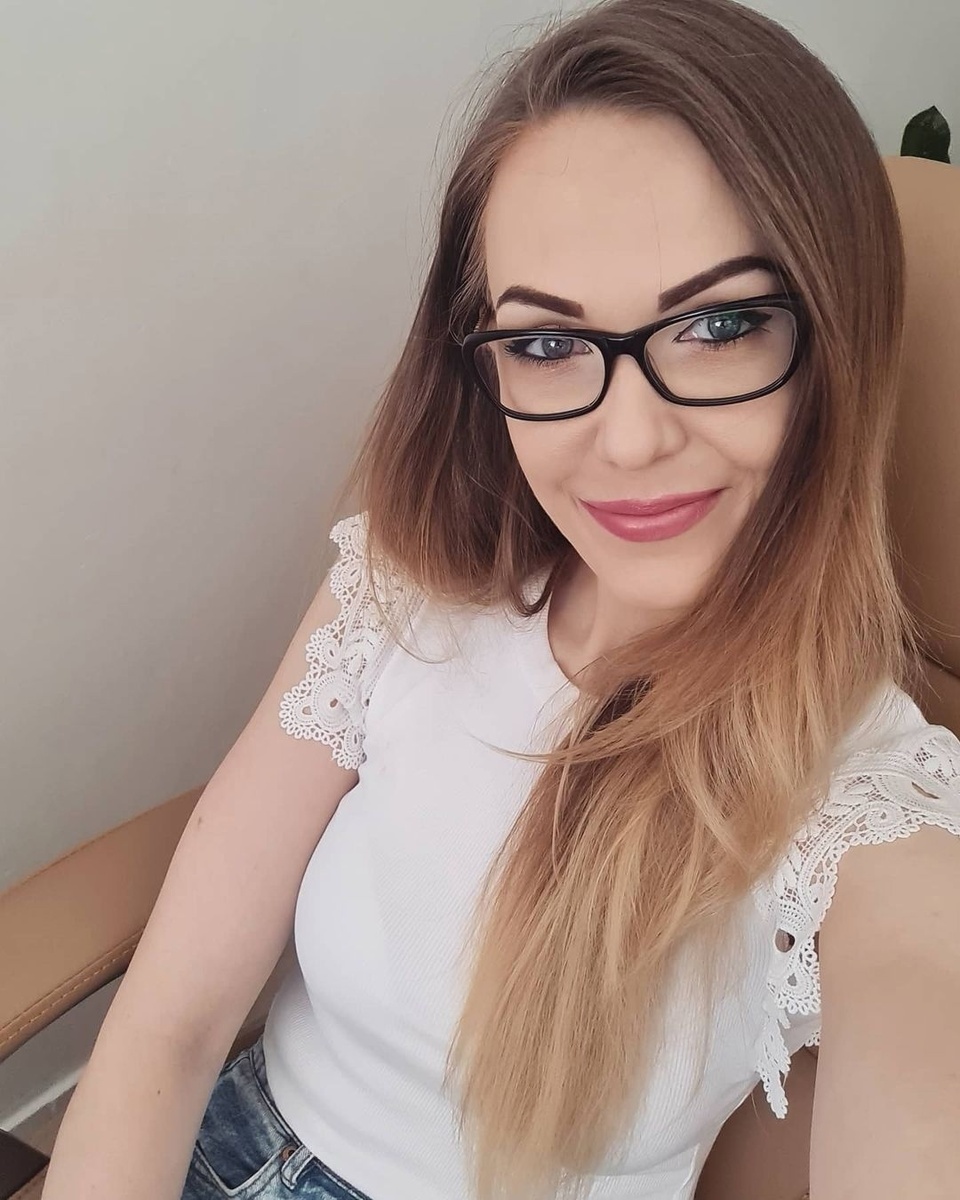 Чёрные очки в строгой оправе придают взгляду загадочность, будто она хранит в себе некую тайну, которую не спешит раскрывать. Её глаза, обрамлённые выразительными бровями, смотрят с лёгкой улыбкой, словно приглашая в свой мир, полный интересных историй.