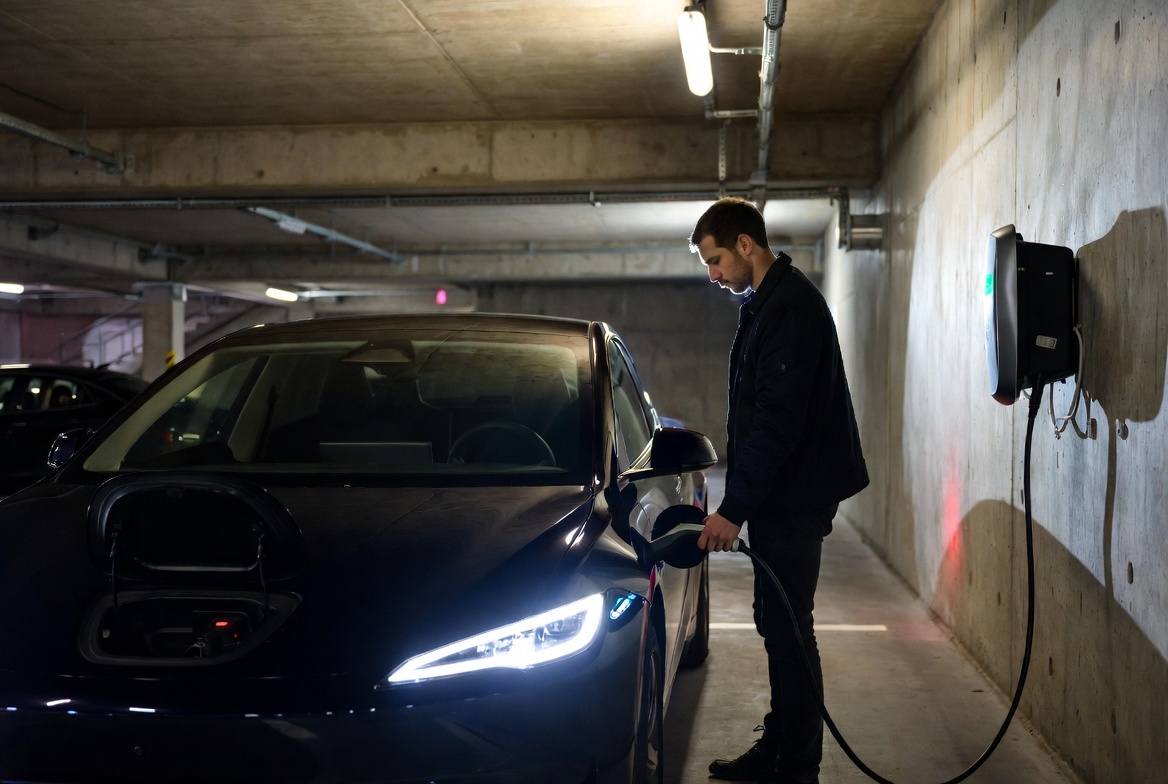 Рядом паркуется белая Tesla Model 3. Из неё выходит женщина, лет сорока, с зарядным кабелем в руках. Подходит к розетке по соседству.