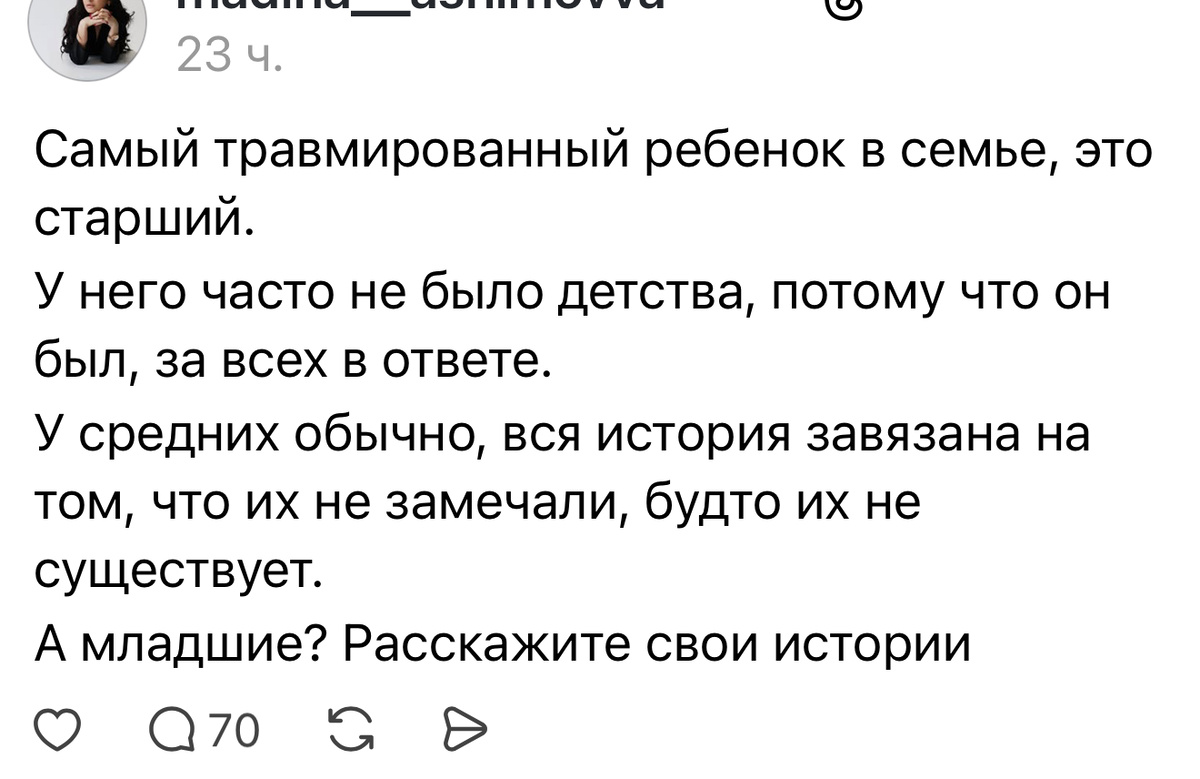- как будто именно старший ребёнок становится тем, через кого род выпускает накопленные боли, долги, тяжёлые истории, незавершённые судьбы. На первенца ложится самый большой пласт напряжения рода, его груз, его память, его незавершённые процессы. И эта нагрузка ощущается всю жизнь — в характере, ответственности, внутреннем взрослении, в той тяжести, которая редко бывает у младших детей.