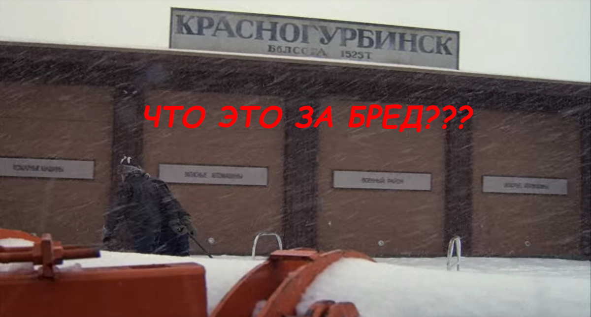 Здесь я хотел бы остановиться на этом подробнее. В западной культуре снимают только американцев, которые плохо говорят с русским акцентом и иногда произносят какую-то бессмыслицу, которую настоящий русский зритель не поймет, как будто они говорят на каком-то старомодном украинском, немного ломаном. Также некоторые слова, написанные русскими буквами, складываются в какую-то бессмыслицу. Например, можно взять кадр из фильма «Рокки 4». Возьмем в качестве примера город Красногурбинск, которого никогда не существовало в реальной жизни в СССР и России, потому что этот город был выдуман для фильма. Там есть надпись: Красногурбинск? Бблсога? 1525Т?