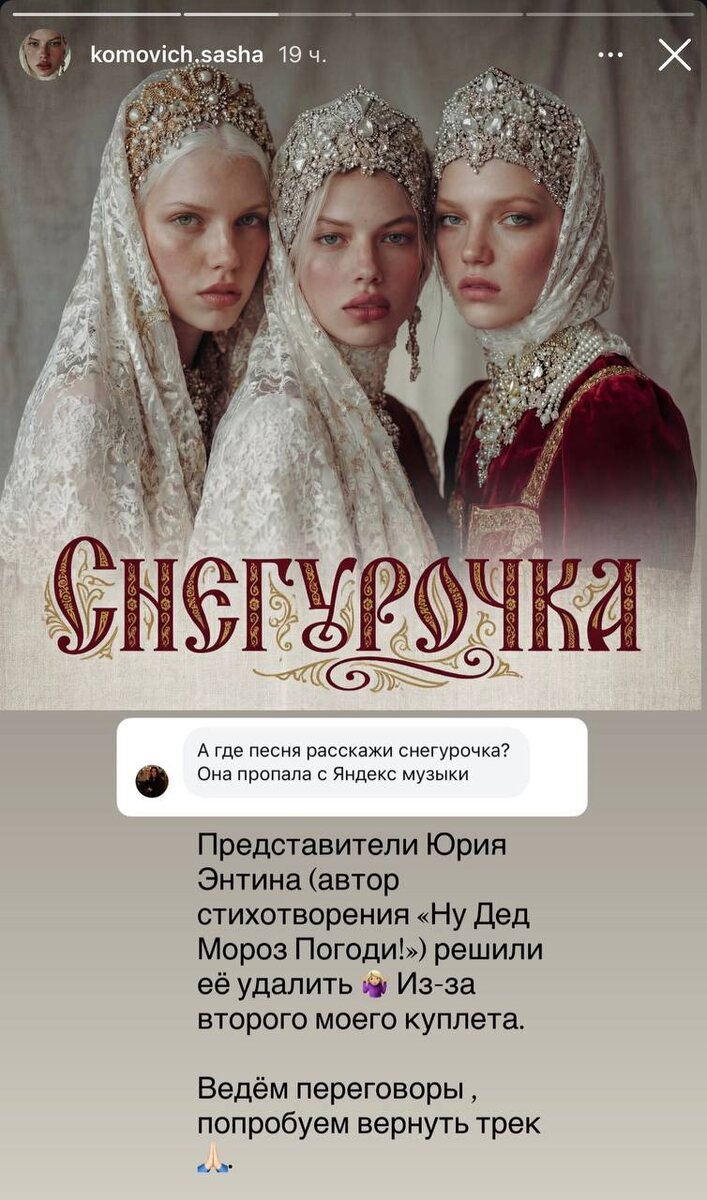 Снегурочка, нейросети и авторские права: коротко о главном Выше кидала вам нашумевший клип. Знакомая с детства песня из «Ну, погоди!» («Ну, скажи, Снегурочка, где была?..») стала вирусным хитом в новом исполнении Саши Комович с нейросетью. Но за красивым клипом встал серьёзный юридический вопрос ⚖️ В чём проблема? Текст песни написал Юрий Энтин, и права на него принадлежат ему или его правопреемникам. Любая переработка (изменение текста, смысла, наложение на новый видеоряд) требует разрешения правообладателя. В комментариях к клипу многие справедливо спрашивают: «А разрешение есть?». Какая ответственность? За использование чужого текста без согласия в России предусмотрены: 🔴Гражданская - крупная компенсация правообладателю, 🔴Административная - штрафы и конфискация, 🔴Уголовная - в особо крупных случаях. ❗️Важно: предъявлять претензии может только сам правообладатель (Юрий Энтин или его наследники), а не просто возмущённые зрители. А как же нейросеть? Это добавляет неопределённос